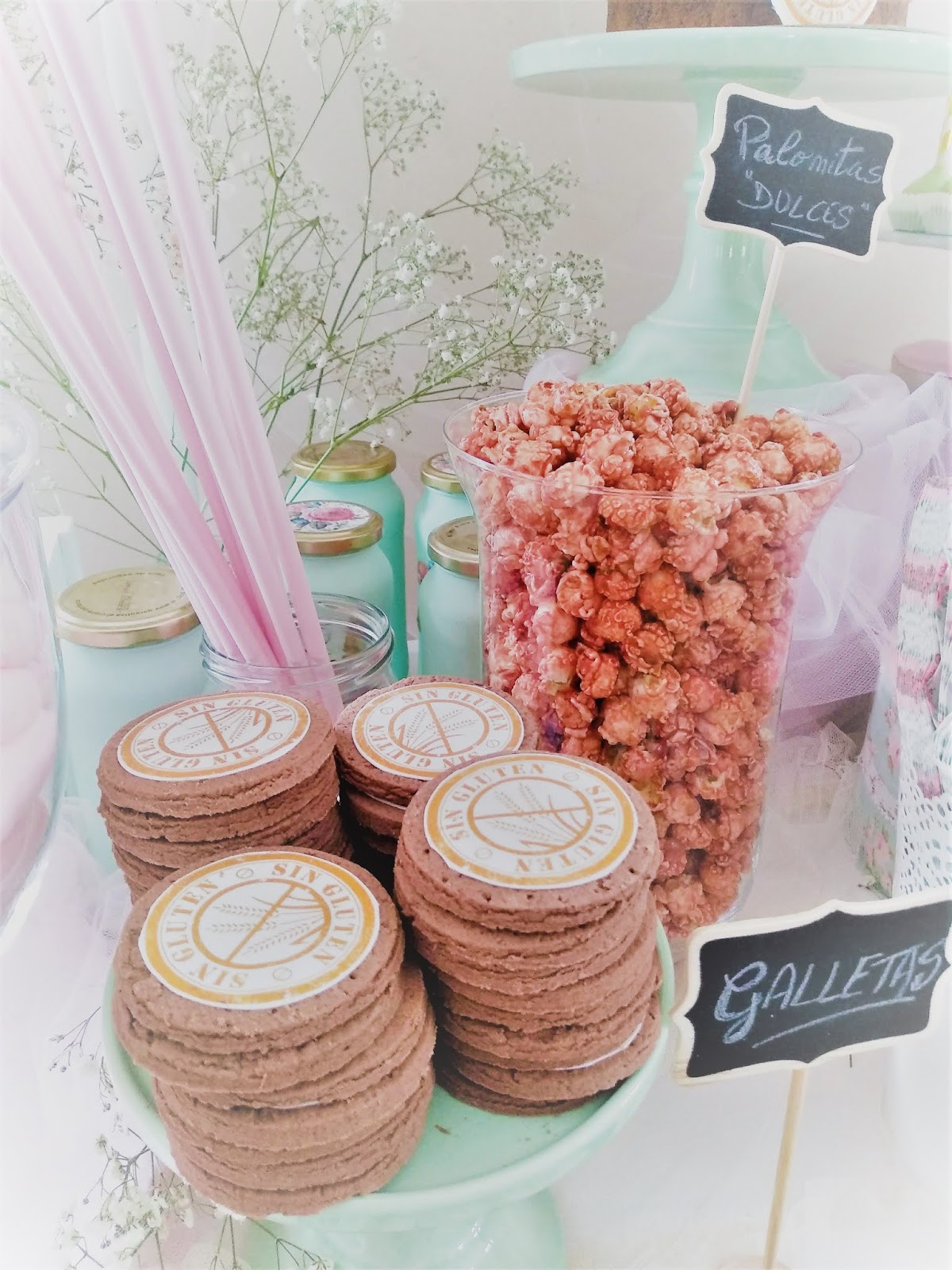 Romanticismo y naturaleza, este era el tema para la mesa dulce. Tarta, galletas, pops, chuches, palomitas dulces, mufins de queso y arándanos,.... hasta trufas caseras hechas por la madrina.
